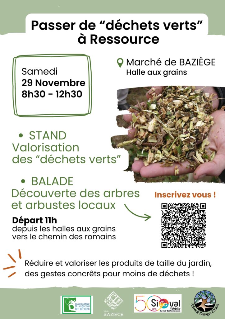Retrouvez l’association au marché de Baziège à la Halle aux grains pour un stand de « Valorisation des déchets verts » en partenariat avec le SICOVAL, dans le cadre de la semaine européenne de la réduction des déchets.